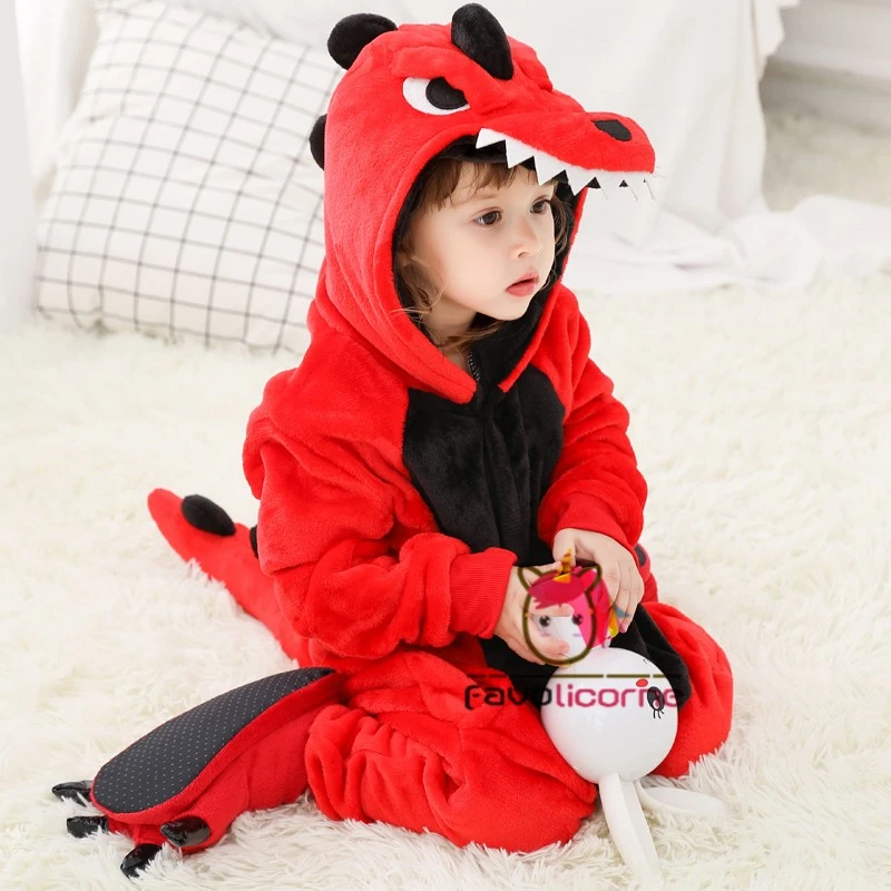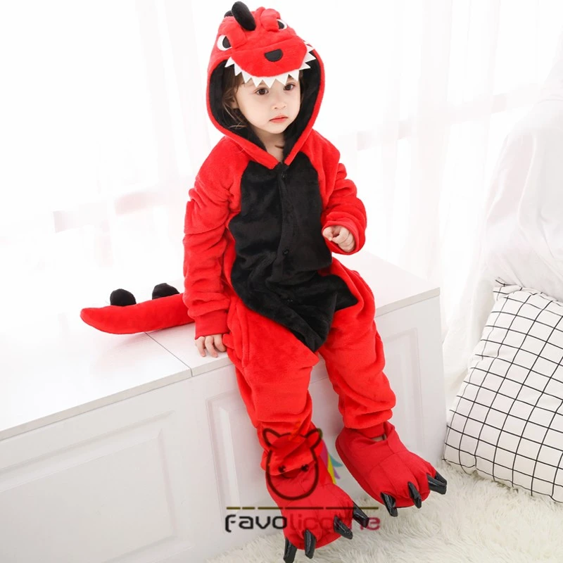 Combinaison Pyjama Enfants Rouge Dinosaure Capuche Garçon & Fille Déguisement Déguisement